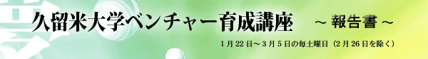 1月22日から3月5日までの毎土曜日(2月26日は除く)に久留米ビジネスプラザ及び、六ツ門大学において開講されました久留米大学ベンチャー育成講座は、延べ126名 の方のご参加をいただきました。